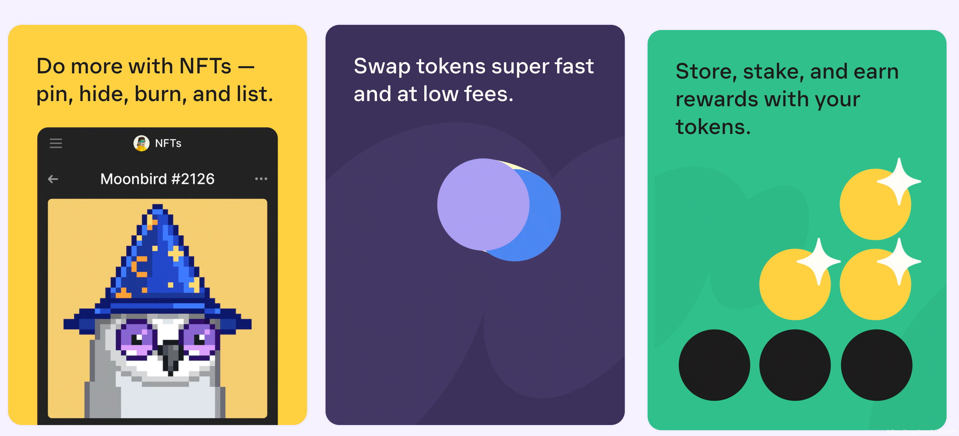 8. **Buy, Swap, and Stake Functionalities**: Users can buy crypto directly within the wallet using services like MoonPay and Coinbase Pay, swap tokens across different networks, and stake Solana tokens to earn rewards.