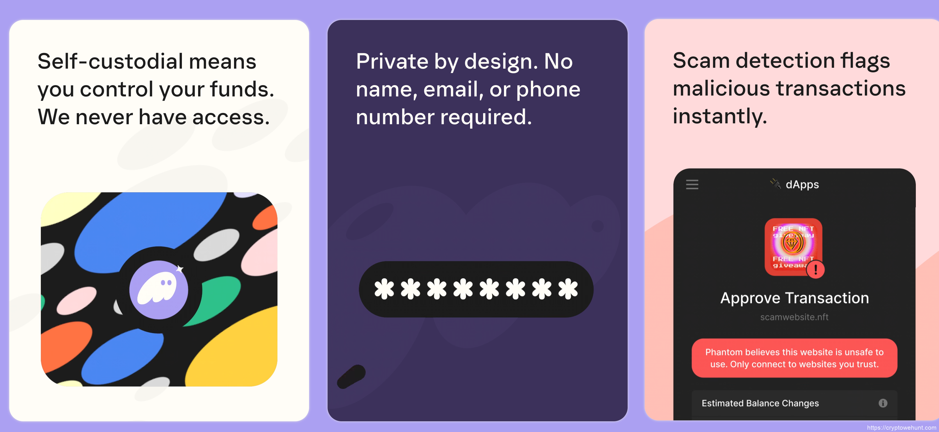 5. **Secure and Non-Custodial**: As a non-custodial wallet, Phantom ensures that users have full control over their private keys and assets. It also integrates with hardware wallets like Ledger for an added layer of security.