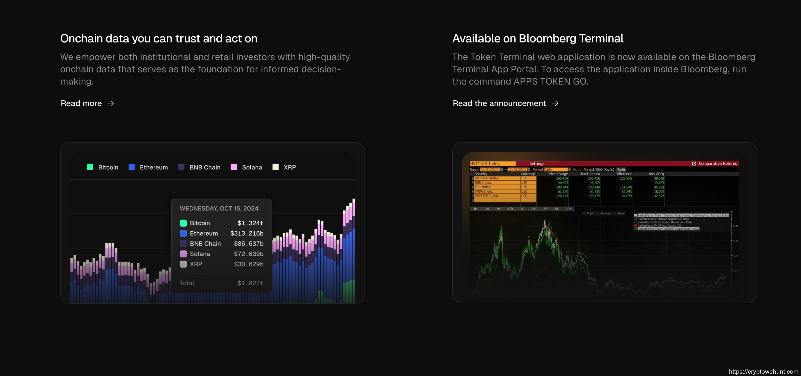 3. **Metrics Offered**: Token Terminal provides a range of market, financial data, and performance indicators, allowing for in-depth analysis of the cryptocurrency market and its sectors.