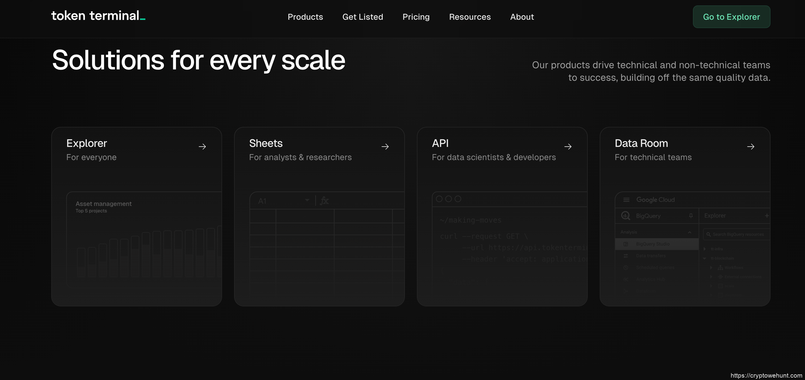 7. **Data Room**: Token Terminal provides a Data Room for in-depth data queries and analysis, allowing registered developers and technical teams to query and analyze multichain data using SQL and Terminal API.